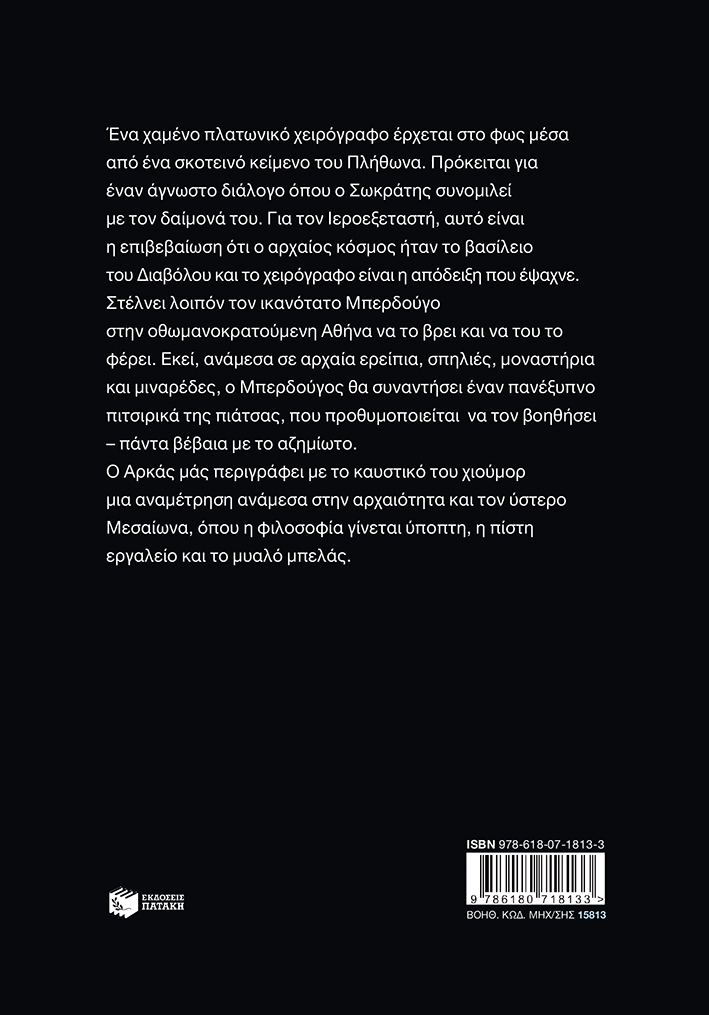 Ο Αρκάς μάς περιγράφει με το καυστικό του χιούμορ μια αναμέτρηση ανάμεσα στην αρχαιότητα και τον ύστερο Μεσαίωνα, όπου η φιλοσοφία γίνεται ύποπτη, η πίστη εργαλείο και το μυαλό μπελάς.